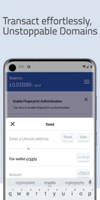 • Does your friend have a Unstoppable Domain? Enter it (eg. official-litewallet.crypto) instead of typing in the full Litecoin address. Precise and quick!