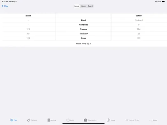 - Calculate the score at any time during the game (area scoring is the default, territory scoring can be selected at the start of a new game)