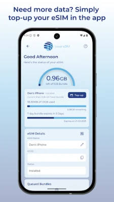 - Top up or add additional eSIMs easily inside the app