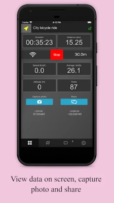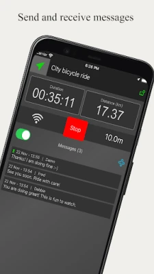 Photos taken in the app will show on the map and can be viewed by others. Messages can be sent and received when the track is running.