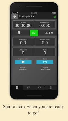 The app gives you duration, distance, speed and altitude as well as your exact position and track lines on a map while tracking. Your position is only tracked when a track has been set up and started and lasts until you stop it.