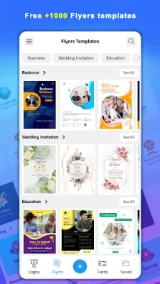 Now there are two new sections in logo creator, which are designing flyers for free and designing personal cards, as designing an advertising flyer has become very easy through logo maker apk .