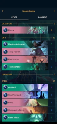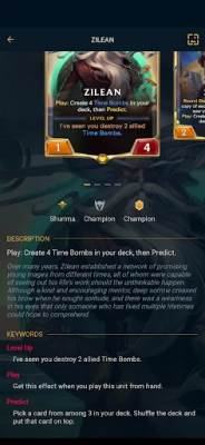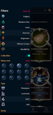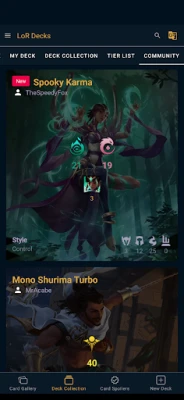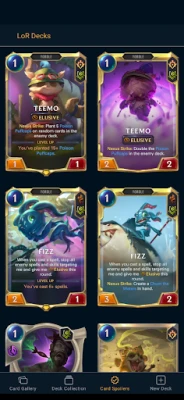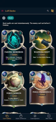 An application that showcases the list of available cards and the best meta decks. The user can use it to browse in game cards and find more information about a particular card's keywords and in game effects. They can also browse a collection of curated decks based on champions, and regions.