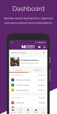 Dashboard - Manage all of your LAFCU accounts with one dashboard. View your available funds, your upcoming payments, how much you’ve deposited, progress towards your savings goals, and personalized recommendations just for you all in a single easy-to-read screen.