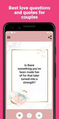 Conversation plays an important role in love life. In this application, you can find many special questions that will allow you to get to know each other and understand your feelings for each other.