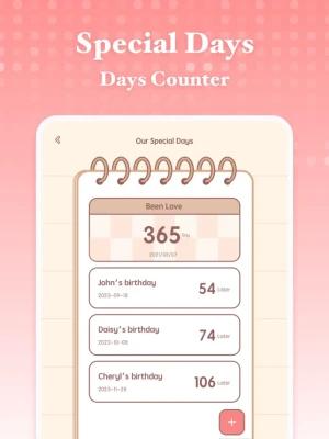 Countdown upcoming anniversaries (birthday, wedding, vacation) or Count up from a special day (love day, been together) in the past.