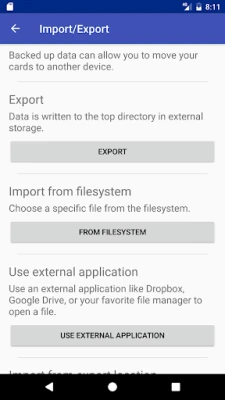The application requires very few permissions, and never attempts to access the Internet. There is an option to backup your cards to local storage. From there you can send the backup somewhere safe.