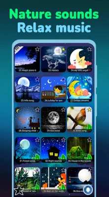 36 melodies for falling asleep, relaxing and calming the child, as well as sounds of nature.