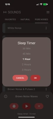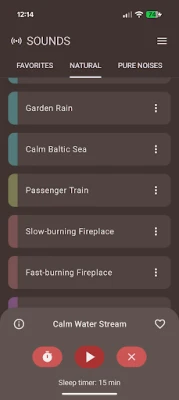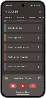 - Brown noise - Pink noise - White noise - Blue noise - Purple noise - Mix of noise waves and noise pulses - Water streams - Rains - Sea waves - Water droplets - Boiling water - Train - Fireplace