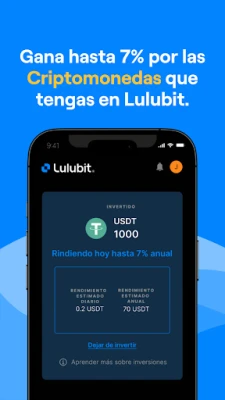 Gana hasta 7% anual por las monedas que tengas en la App de Lulubit. Siempre estarán tus fondos disponibles, y mientras no los uses, generarán ganancias.
