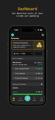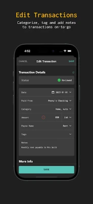 - See detailed stats of your income and spending - Dive into each category of your Spending Breakdown - Review transactions quickly with a swipe - Categorize, tag and add notes to transactions on-to-go - See patterns of your spending with monthly stats and charts
