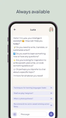 Natural Interaction: Talk to Luzia via text or voice, enjoying a fluid and natural interaction, as if you were chatting with a friend.