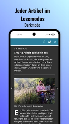 Stell Dir Deine Schriftgröße ein und wenn Du möchtest, lies im angenehmen Dark-Mode.