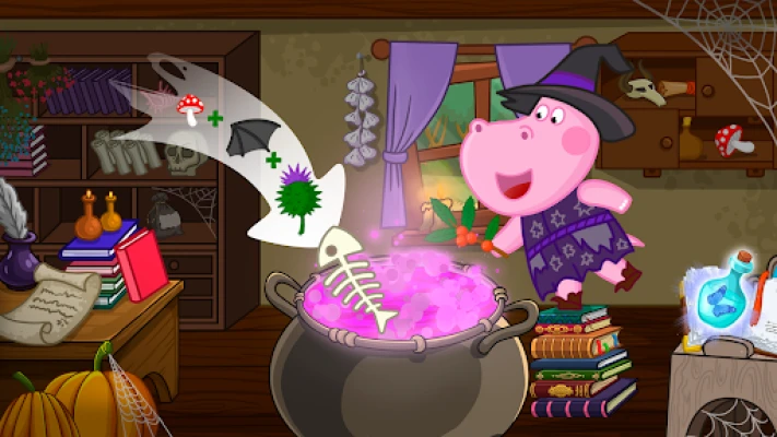 Hippo family has a very interesting relative aunt Morgana. Why is she so interesting? First of all because of the fact that she is a real witch! But it is no use to be afraid, nothing bad won't happen. Instead of bedevil somebody or flying with a broom, this lady works in the forest sorcery shop with exciting potions. She is a certified alchemist, she can make magic potions for any case in life. And also a good sorceress helps anybody who comes to her shop. But even a good sorceress can't work forever. Once she decided to make a holiday and fly to Miami Beach with her broom. But there are so many clients coming to the shop every day. Could all the people who need an urgent help not to get it? The Witch has a niece, she can work while her relative is on holiday. Today the main witch is our curious Hippo! But what to do if the niece is not an alchemist? How could she make a magic potion without a sorcery certificate? We need your help! Find book, where there are all the recipes, potions and ancient maps, where there are also places with ingredients pointed on the map. Find the correct ingredients on a graveyard, in the ghost castle and in the swampland! Make magic potions and experiments, play the games and create new unbelievable spells!