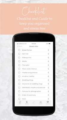 - To Do lists broken down into what you need to organise as a priority, leading up to the wedding, the month prior, week prior, day prior, wedding day, day after and the once you return from your honeymoon.