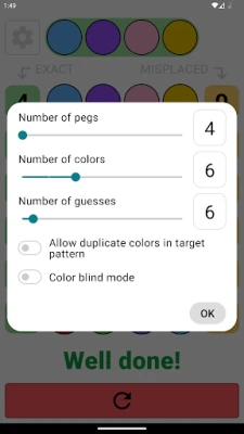 No ads, and several settings to adjust the difficulty level: - number of colors in the pattern - total number of colors available - allow duplicate colors