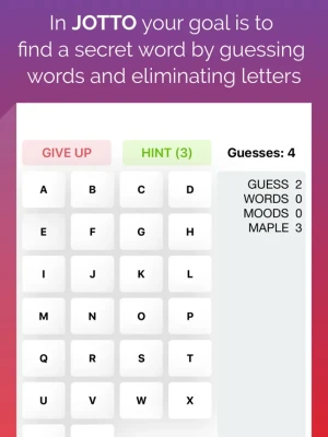 Simply guess your own five letter words and Jotto will tell you how many letters your guess has in common with the secret word. Rule out letters you know are not in the word by tapping them once to turn them red, or tap them twice to turn them green if you’re sure they are included.