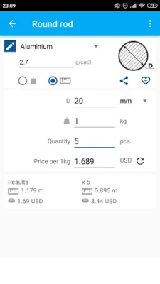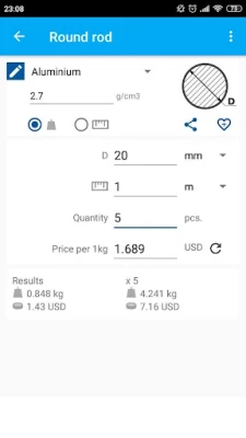 The application calculates the price of the item (e.g. pipe) based on material prices