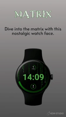 Dive into the matrix with this nostalgic watch face, inspired by the movie The Matrix. Tell the time while feeling like Neo with this watch face, the matrix rain in the background will catch eyes of everyone around. You can also choose different colors for the Time so it gets even easier to tell time.