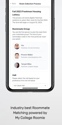 · Join a private environment for your school or building · Create a profile and complete a Compatibility Questionnaire · View the % Compatibility of your best matches · Send roommate requests to your desired roommates · Private and group chat with others.