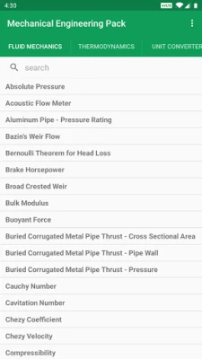 Fluid Mechanics Calculator contains 97 calculators, that can quickly and easily calculate different fluid mechanics, mechanical, civil, structural, pipe flow and engineering parameters. Automatic and accurate calculations and conversions with every unit and value changes.