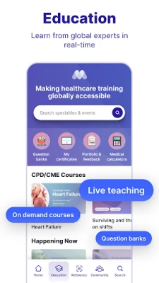 - Live training courses and accredited CPD/CME sessions. - Build an app for your department guidelines, induction and resources. - Daily teaching sessions. - Peer-to-peer support via Q&A and discussion threads. - Clinical calculators. - Exam revision question banks.