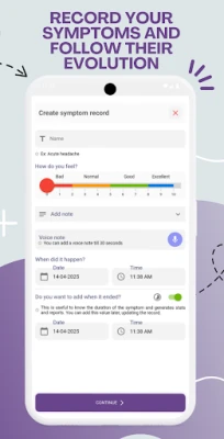 ๐ค Detailed Symptom Log: Noticing something? Quickly log your symptoms: describe what you feel, its intensity, frequency, and what medication you've taken. Keep a useful symptom diary to understand your evolution and communicate better with your doctor.