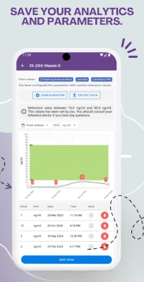 ๐ฌ Lab Test Tracking: Save your laboratory test results. Visualize parameter trends (by setting ranges), create custom parameters, and export your data (PDF/Excel).