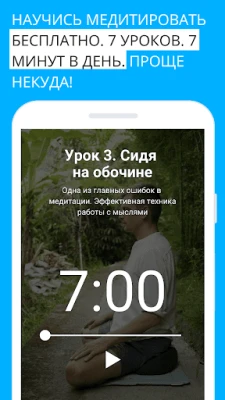 Практики медитации на дыхание и осознанности для начинающих c уроками на русском языке. Не знаете, как медитировать правильно и с чего начать, и хотите научиться? Скачивайте приложение и курс “Медитация для начинающих 7” и научитесь медитировать бесплатно.