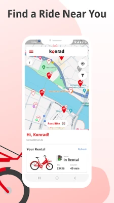 With the “My konrad” app for iOS and Android you can easily find a konrad bike, cargo bike or e-cargo bike at the stations in Konstanz, hop on and start cycling straight away - around the clock, all with your smartphone! The app simplifies borrowing and returning and always shows you the available Konrad bikes in your area.