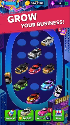 Buy, merge cars and manage race track to earn money. Unlock new garage slots and expand. Do not forget to collect cars and build car empire. Enjoy events with: trucks, tanks or merge plane.