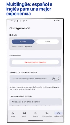 Elige el idioma de la app (español o inglés), controla la pantalla de bienvenida y gestiona tus favoritos con facilidad.