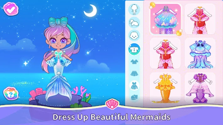 Choose from dozens of outfits, hairstyles, accessories, and fantasy looks. Style your mermaids for concerts, parties, beach days, or daily life in the ocean kingdom.