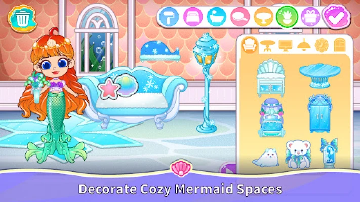 Dive into a beautiful ocean kingdom filled with colorful rooms, interactive items, and fun surprises. Whether you enjoy dress-up, play house activities, storytelling, or exploring new underwater places, this world is yours to create freely.
