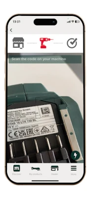 Register new product: You can register your purchased products for the Metabo XXL warranty, and Metabo FULL Service, as well as upload associated invoices via 2D Matrix Code scan. How? Just use the camera on your smartphone to scan the 2D code on the product.