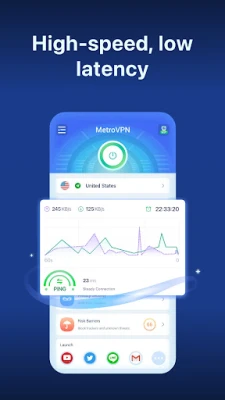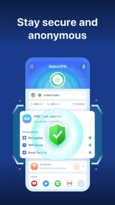 MetroVPN not only hides your IP address but also encrypts your internet traffic. This ensures that your passwords and other private data stay secure, even when you use public or untrustworthy Wi-Fi networks. Enjoy surfing the web without worrying about surveillance.
