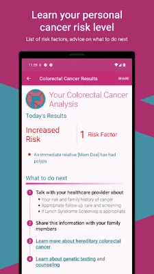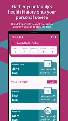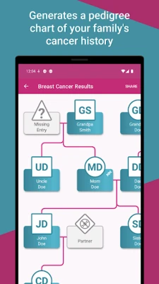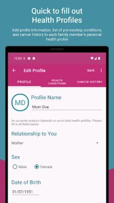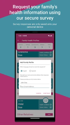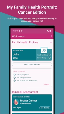 Use the My Family Health Portrait (MFHP): Cancer app to collect your family history of cancer and determine your risk for breast, ovarian, and/or colorectal cancer. You can view your risk factors and learn about what to do next. You will also be able to see your family's history of cancer in a family tree.
