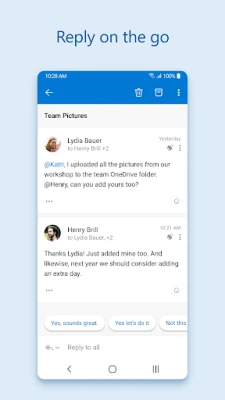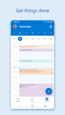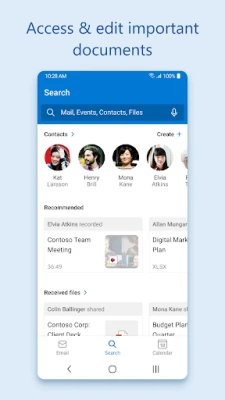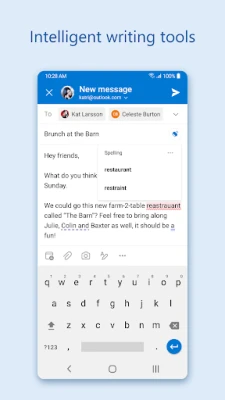 Outlook is free for personal use. You can connect your various accounts, like Microsoft Exchange, Microsoft 365, Outlook.com, Gmail, Yahoo Mail, iCloud and IMAP, giving you flexibility to stay connected on the go. Write polished, professional-quality emails with built-in intelligent editing tools for real-time typing suggestions, grammar, and spelling help. Send documents, photos, or video from your Files list, OneDrive, or your Gallery. Open Word, Excel, and PowerPoint documents right from your inbox.