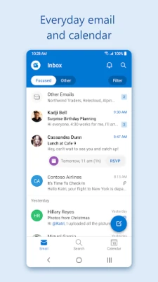 Connect and coordinate your busy life with Microsoft Outlook . Stay on top of your day through a secure email and calendar app that lets you manage your emails, files and calendar all in one place. Stay productive with whatever hits your inbox, whether it's from your work, school or your personal account. Organize your email intelligently, filtered into Focused and Other so you can easily see your most important messages. Keep your day organized by seeing multiple calendars at a glance.