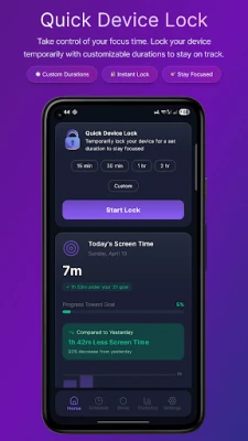 Quick Device Lock. Lock your entire phone for a set duration. Your whole device goes dark until the timer ends. Perfect for deep focus sessions.