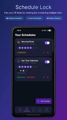 Custom schedules for recurring sessions. Advanced strict modes. Detailed usage insights. Location-based auto-blocking.
