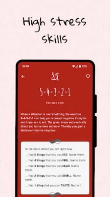 Skills help you interrupt high stress. The little helper "Stone in the shoe" draws your focus towards your body perception away from strong, negative feelings. Use "5-4-3-2-1" to concentrate deliberately on things in the outside world and distract yourself actively from overwhelming emotions.