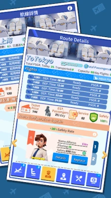 Hundreds of captains/stewardesses can be recruited to arrange suitable flight routes. Improve technology and service level to create superb routes. After the completion of each flight, passengers will evaluate their experience. Always pay attention to the evaluation and make targeted improvements. Passengers will also occasionally chat about their own journey. Are you ready for their stories?