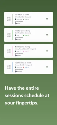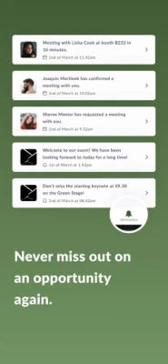 Features: AI matchmaking, meeting scheduler, personalized agenda, interactive floorplans, and session content.