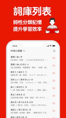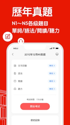 MOJiTest是專注於日語能力考(JLPT)的專業平台,致力於幫助百萬日語愛好者零基礎自學考級。我們提供N1-N5全套權威詞庫、考研專用藍寶書、官方合作綠寶書、高考必修選修全套詞庫,更有歷年配套真題及解析,讓你沈浸模擬上場不慌張。背單詞、做真題,就用MOJiTest!