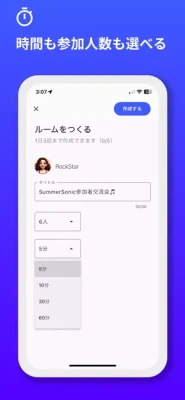 ルームのオープン時間は5分、10分、30分、60分から選べ、参加人数も2人から最大8人まで自由に設定できます。短時間のクイックチャットから長時間のディスカッションまで、用途に合わせて利用可能です。