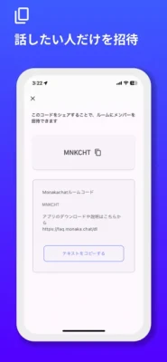 招待コードを使って、自分が話したい人だけをルームに招待できます。招待したい人にルームコードを伝えるだけで、簡単に参加してもらえるので、クローズドな空間でのコミュニケーションが実現します。