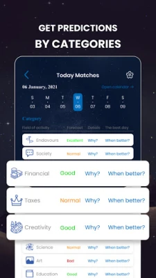 The app is free to select the three categories that are most relevant to the individual user. The app will evaluate prospects and opportunities in the selected categories in terms of the influence of the moon's energy. If you want to receive information about how favorable today's lunar day is for other categories, you can subscribe or watch the ads. There are about 20 categories available to explore, such as finance, job search, creativity, art, and many more.