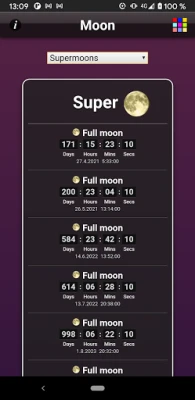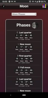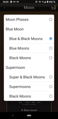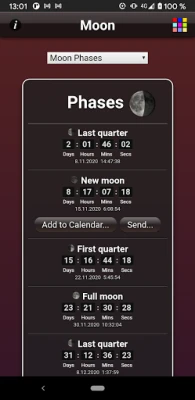 Features: - add moon phases to calendar - share moon phase dates - blue moon and black moon detection - supermoon and super black moon detection - shows current moon cover - shows the last phase for 1 day after the event