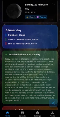 What's inside? ✨ Cosmic Passport: Calculate your unique natal chart. Discover your Sun, Moon, and Ascendant signs, and unlock the secrets of your Destiny Number. 🌑 Lunar Intention Garden: Harness the energy of the New Moon! "Plant" your goals like seeds and watch them grow alongside the Moon's phases. 🔮 Forecasts for 21 spheres of life: From finances and career to love and health. Get accurate daily guidance based on the current Moon phase.